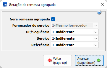 Nessa janela são definidos os agrupados para geração da remessa de serviço externo a partir da opção "P-Gerar Remessa Agrupada". + Saiba mais