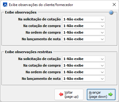 Parâmetros referente a exibição das observações e observações restritas do cadastro de fornecedor.