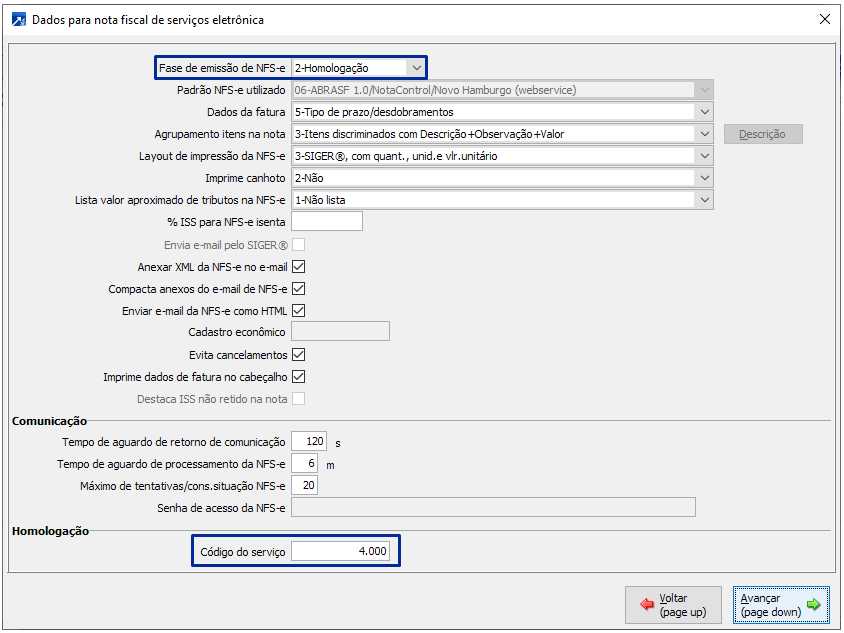 No menu FAT 1.2-A, botões <Nota fiscal> e <Dados para NFS-e>, informar o "Código Tributação Município: 4000" no campo "Código do serviço" e selecionar a opção 2-Homologação no campo "Fase de emissão de NFS-e", exemplo na imagem a seguir.