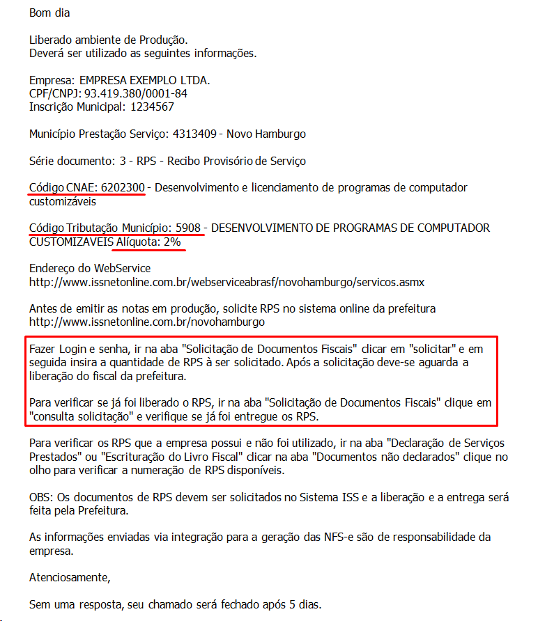 Na hipótese das notas estarem corretas na fase de homologação, a Nota Control enviará e-mail com as informações para configuração do serviço, como CNAE, código do serviço na Prefeitura e percentual de ISS, conforme exemplo na imagem a seguir.