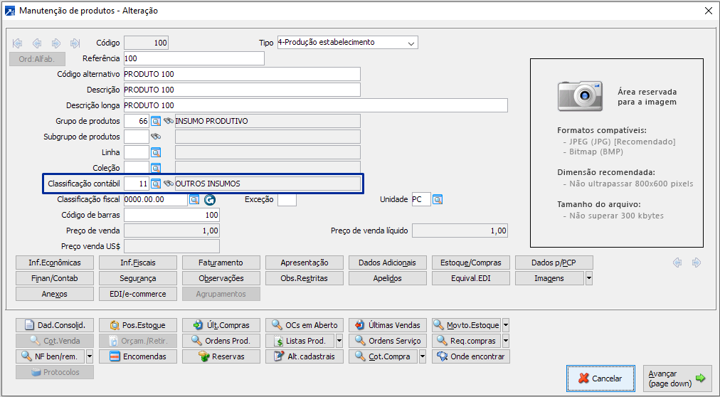 Deverá ser informada em cada produto a classificação contábil adequada.