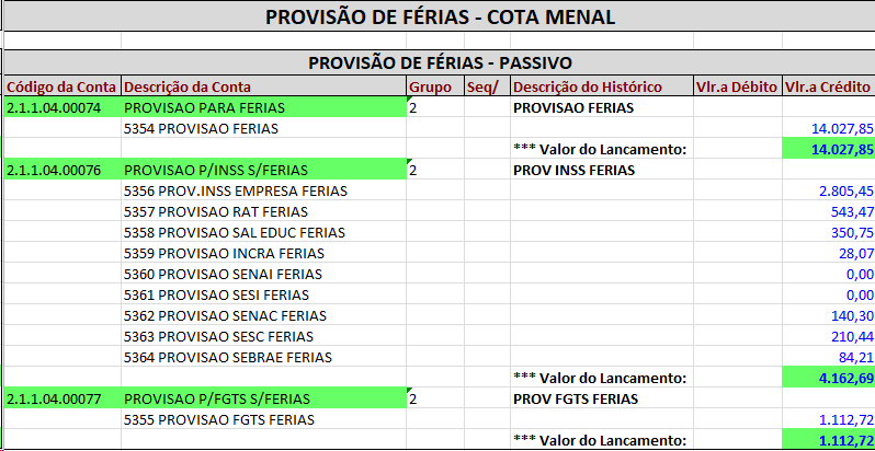 - Quando ocorrer pagamento de férias normais ou pagas em rescisão, deve ser feito o lançamento dos pagamentos nas contas de provisão do passivo a débito, referente aos pagamentos, os encargos de INSS e FGTS.