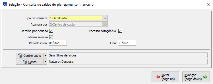 Este botão acessa a "Seleção - Consulta de saldos do planejamento financeiro", possibilitanto a mudança dos parâmetros para processamento da exibição dos saldos.