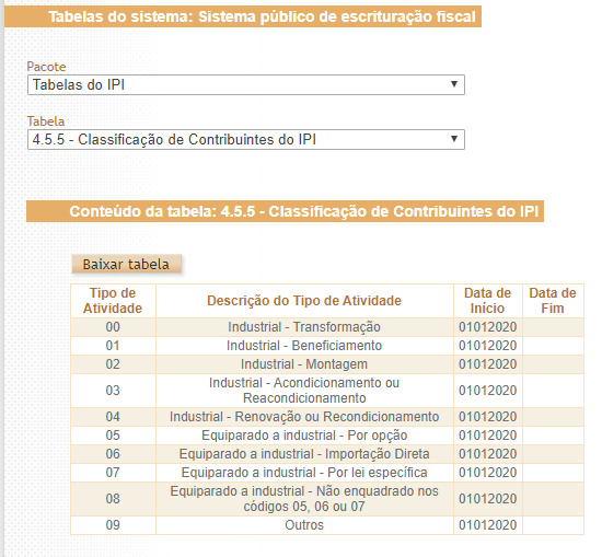 Imagem da tabela no site do SPED: