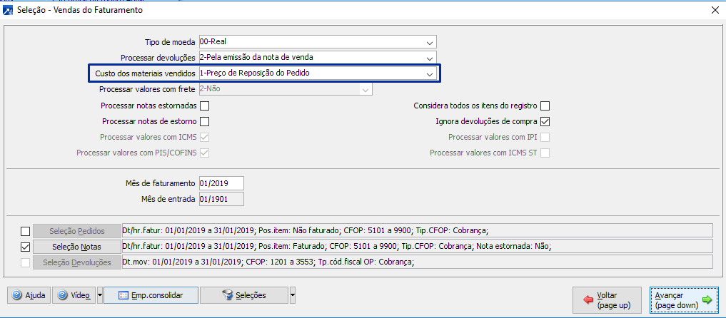 Ao avançar a tela inicial, será exibida a Seleção Padrão de Vendas, e nela o campo "Custo dos materiais vendidos".