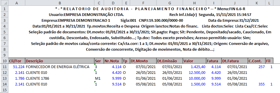 Este relatório tem como finalidade identificar os documentos e movimentos de caixa/conta corrente que não possuem dados do planejamento financeiro, ou que possuem os dados errados.