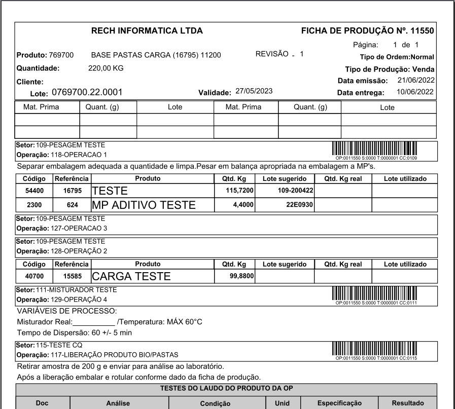 Vejamos a seguir um modelo de OP apta a receber o apontamento via GIN 2.3-O com códigos de barras nos centros de custo que compõem a OP.