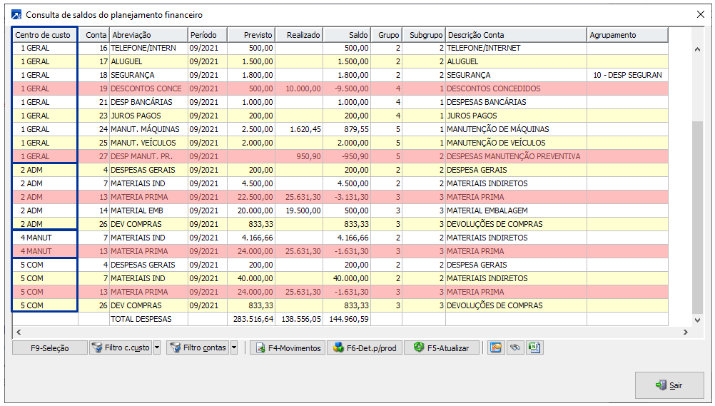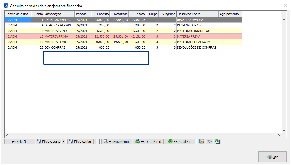 A consulta de saldos do planejamento financeiro possibilita a análise dos valores previstos x realizados dos movimentos do planejamento financeiro, bem como o saldo de cada conta e centro de custo.