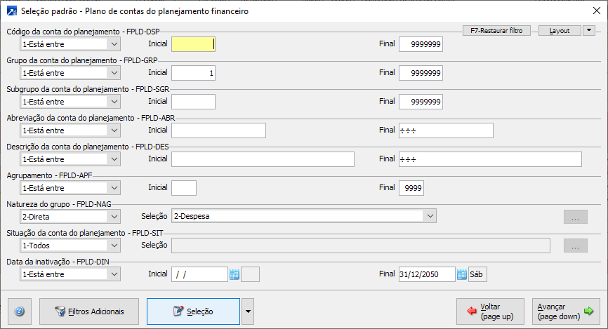 Esse botão acessa a "Seleção padrão - Plano de contas do planejamento financeiro", possibilitando a seleção das das contas para consulta dos saldos do planejamento.