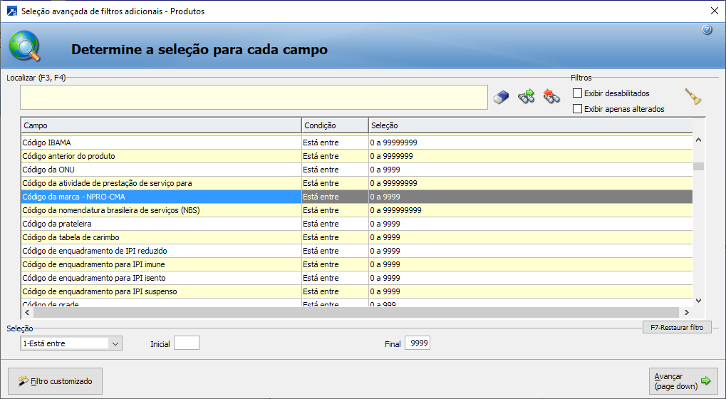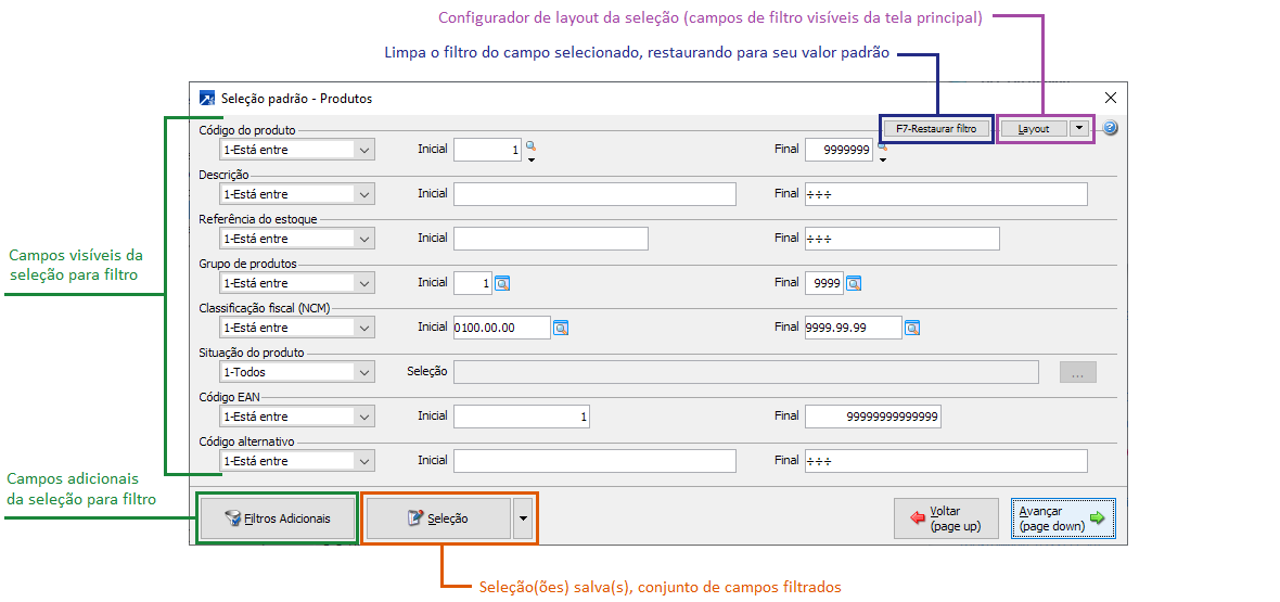 Cada tabela da base de dados possui uma seleção padrão, é possível identificar qual tabela estamos filtrando pelo título da janela de seleção. Exemplo: "Seleção padrão - Produtos", indica que estamos filtrando campos do cadastro de produtos.