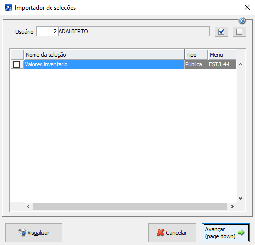 Ao selecionar o usuário, são exibidos todas seleções disponíveis para importação, da tabela em questão.
