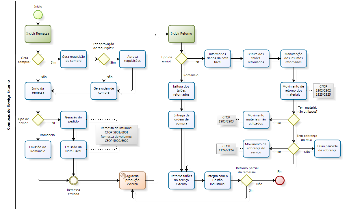 A compra do serviço se dá pela geração de requisição de compra e da ordem de compra, a partir dos serviços externos definidos na estrutura do produto pronto.