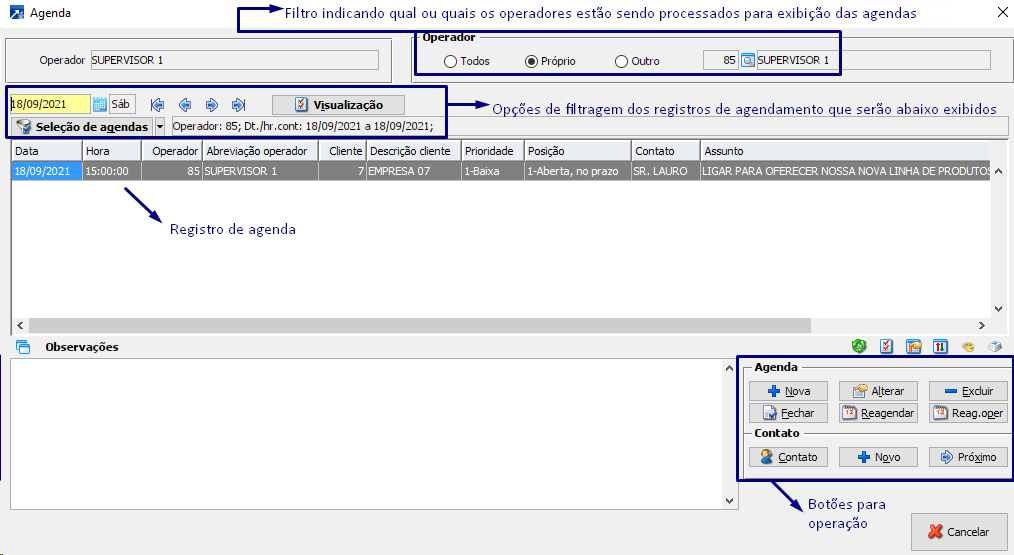 Também é a partir da agenda que podemos registrar os "contatos" efetuados junto aos clientes, de forma que, convém que os operadores trabalhem sempre a partir da mesma.