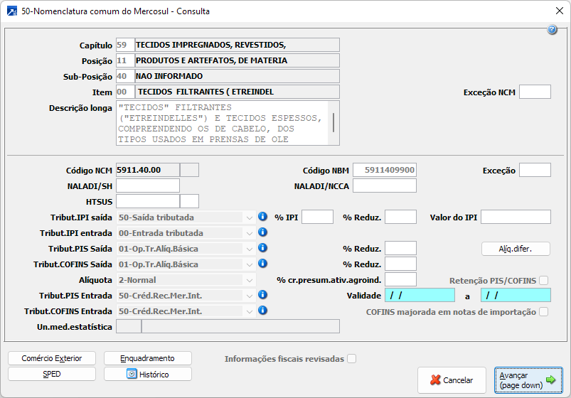 Cadastro da tabela genérica - 50-Nomenclatura comum do Mercosul