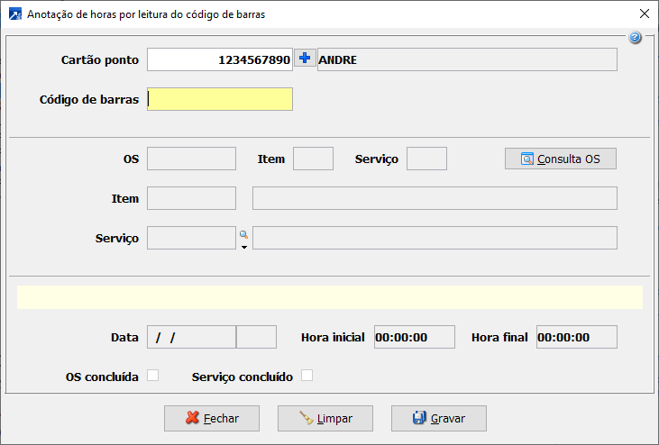 Possui atalho para carregar o técnico padrão informado anteriormente e também para repetir a anotação de horas de outro técnico para o serviço.