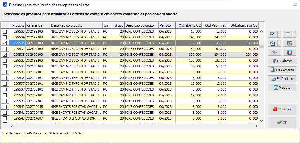 Após a confirmação na janela de produtos para atualização das compras em aberto: