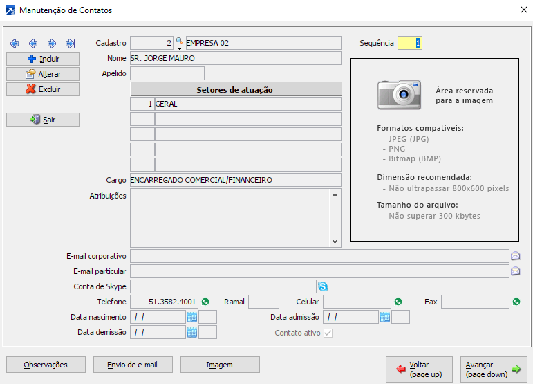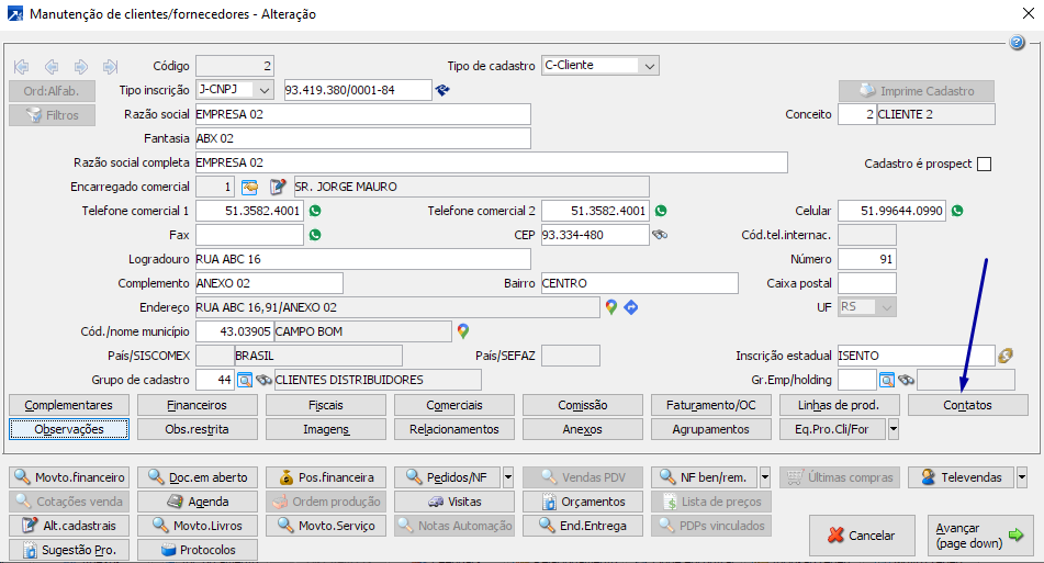 Cadastro de contatos do cliente.