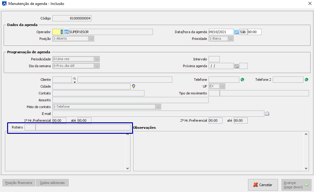 Caso o contato esteja sendo criado sem um agendamento o roteiro poderá ser inserido por dentro do próprio contato.