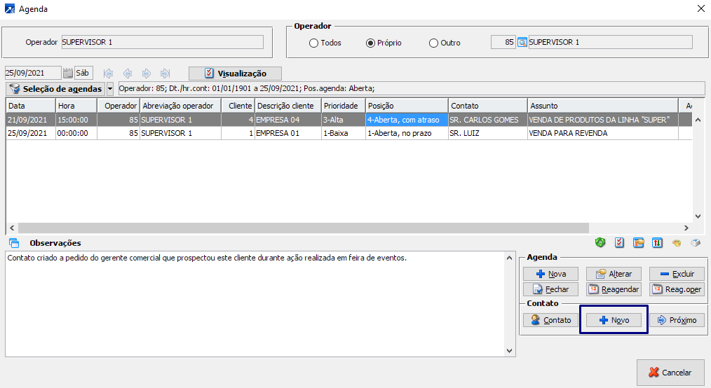 Ou seja: é possível efetuar novos agendamentos por dentro de um contato.