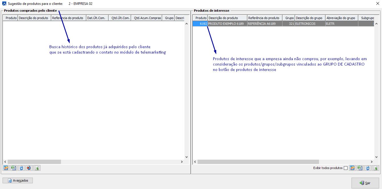 Dentro do deste grupo de cadastro, o usuário irá informar quais são os produtos de interesse deste segmento para que assim quando um atendente de telemarketing efetuar um contato junto a um cliente vinculado ao grupo "varejo" ele consiga rapidamente visualizar quais os produtos ele deve oferecer.