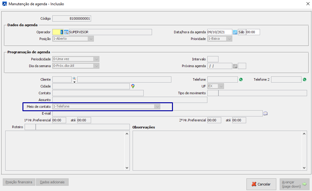 Caso contato esteja sendo realizado por meio de um agendamento, o "meio de contato" poderá vir pré-informado da agenda.