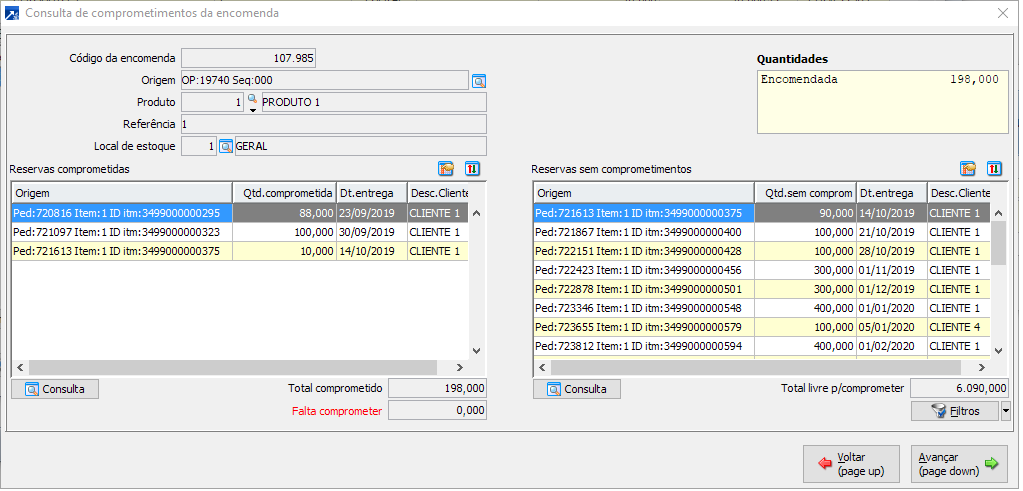 Exibe as encomendas comprometidas com a necessidade de reserva