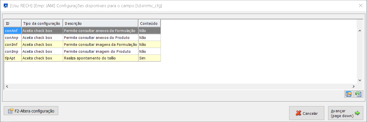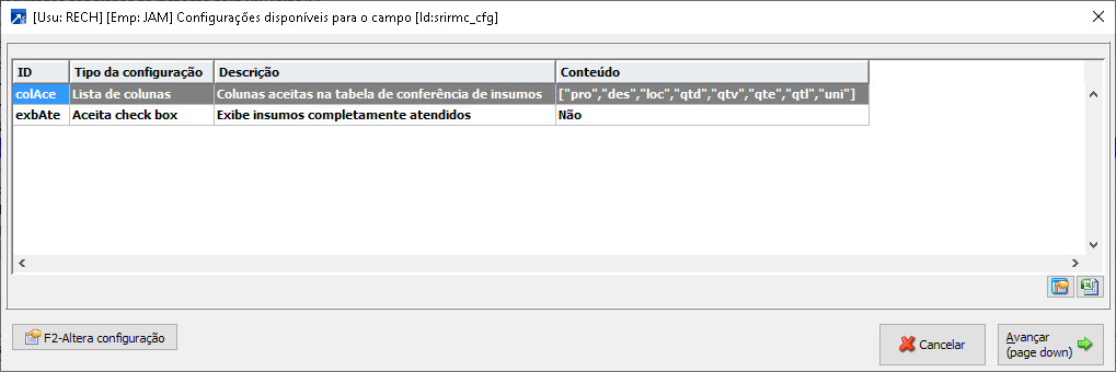 'Colunas aceitas na tabela de conferência de insumos': Permite configurar quais colunas devem ser exibidas.