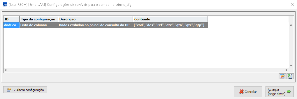 Tabela com os registros de produção da OP consultada. As colunas a serem exibidas podem ser configuradas conforme imagem abaixo.