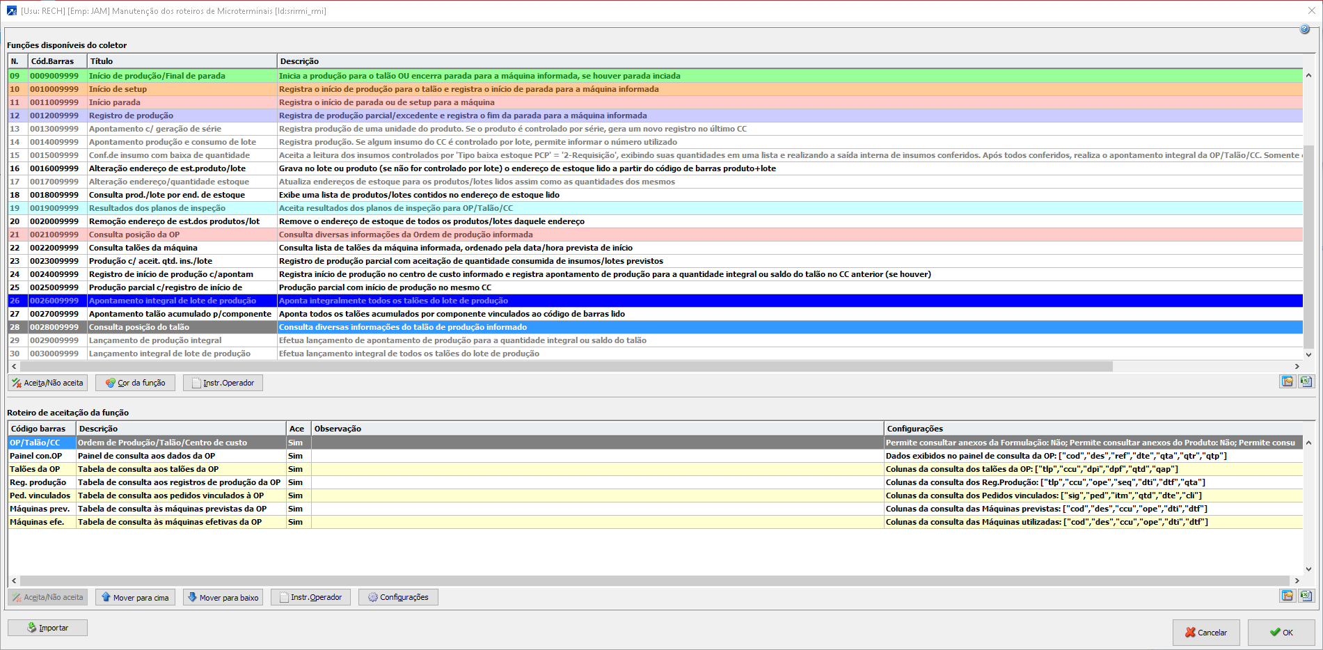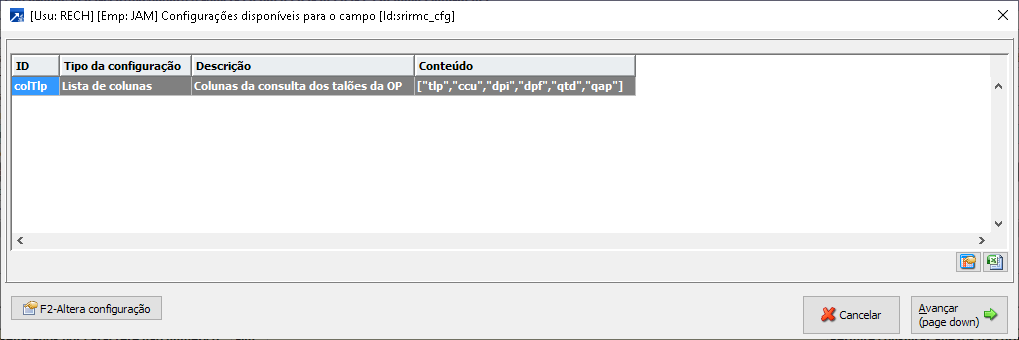 Tabela com os registros de produção da OP consultada. As colunas a serem exibidas podem ser configuradas conforme imagem abaixo.