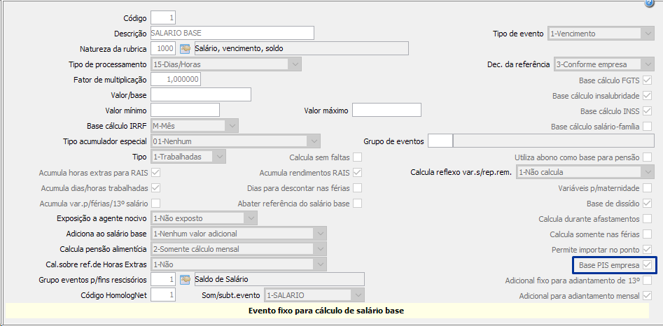 A base do PIS é formada pela configuração nos eventos, menu FPA 1.7-A, fcheck box "Base PIS" marcada, indica que o evento faz parte da base para o cálculo do PIS.