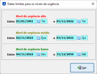 Permite classificar as encomendas, por cores, conforme o prazo de entrega. Na tela, é possível informar os prazos em dias para alta e baixa urgência.