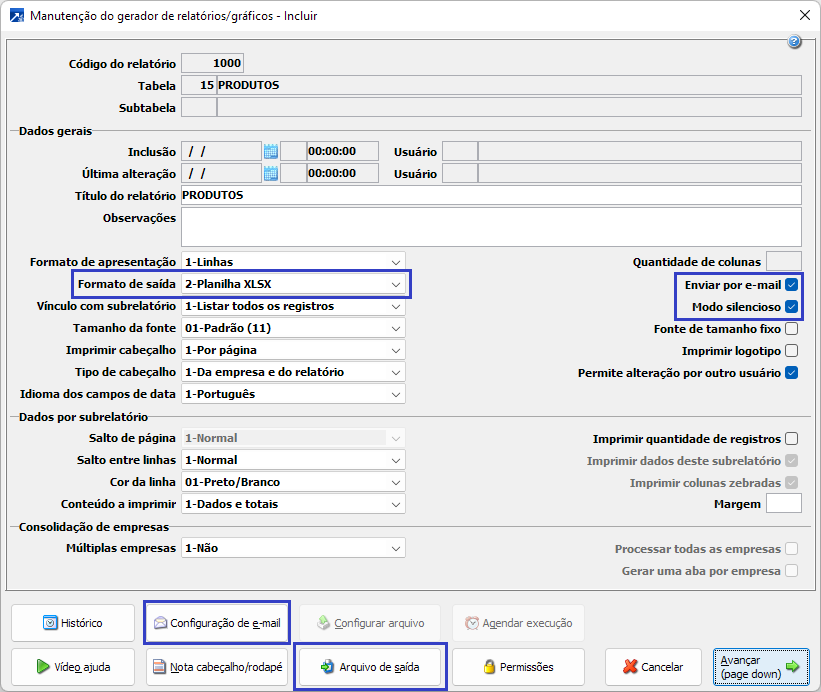 O habitual nos relatórios enviados por e-mail é que o formato de saída seja 2-Planilha XLSX.