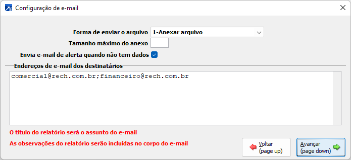No botão [Configuração de e-mail] nós vamos informar quais são os endereços de correio eletrônico que irão receber este relatório via e-mail.