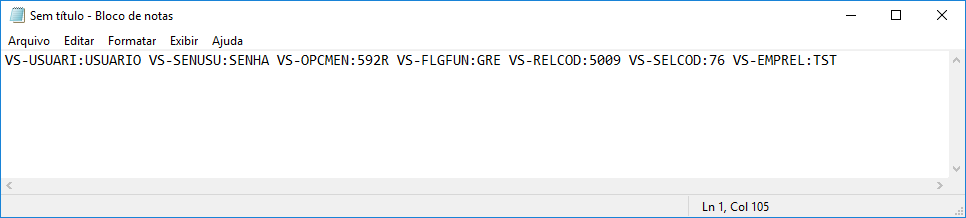 Ex: VS-USUARI:USUARIO VS-SENUSU:SENHA VS-OPCMEN:592R VS-FLGFUN:GRE VS-RELCOD:5009 VS-SELCOD:76 VS-EMPREL:TST