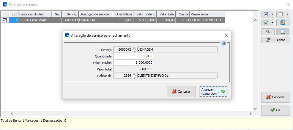 No botão <F5-Altera> é possível ainda definir quantidades, valores e qual cliente deve ser cobrado o serviço no momento da emissão da NF.