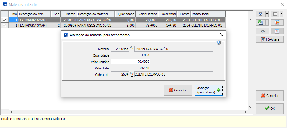 No botão <F5-Altera> é possível ainda definir quantidades, valores e qual cliente deve ser cobrado o material no momento da emissão da NF.