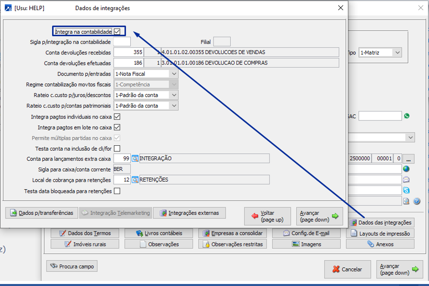 Para integrar as contas contábeis constantes nos cadastros de clientes e fornecedores, acessar o menu 1.1-P de qualquer módulo, no campo Integra conta contábil do cliente/ fornecedor selecionar a opção 4-Cfe. histórico.