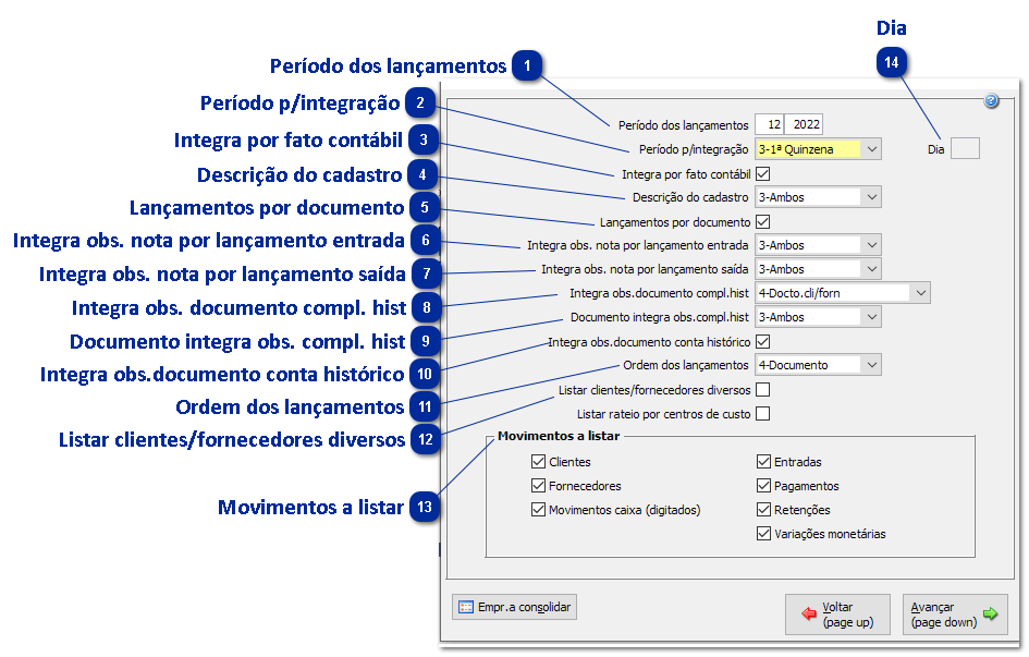 No campo Integra observação docto no compl. hist., selecionar a opção 3-Todas observações e no Histórico caixa/conta corrente, opção C-Contabilidade.