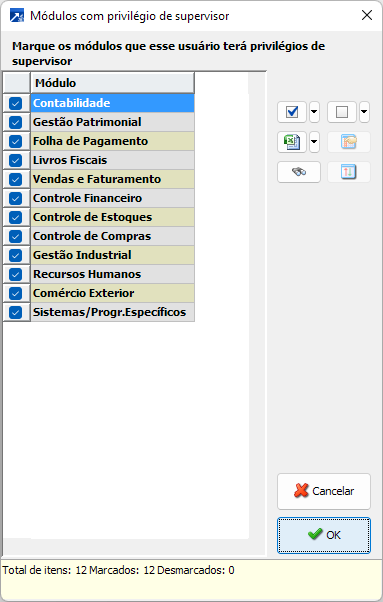 Obs.: quando o usuário possui privilégio de supervisor em TODOS os módulos, automaticamente ele se torna um usuários supervisor (master).