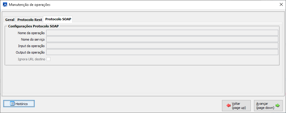 Nessa aba estão disponíveis as configurações do protocolo SOAP, os campos não estão habilitados para alterações.
