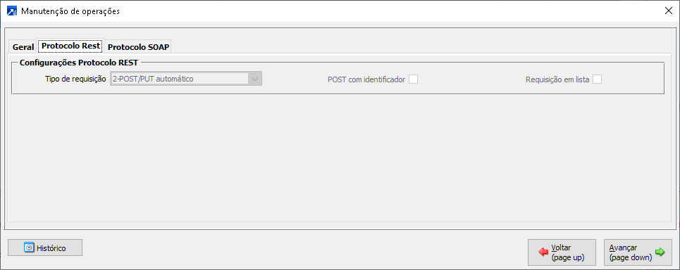 Nessa aba estão disponíveis as configurações do protocolo REST, os campos não estão habilitados para alterações.