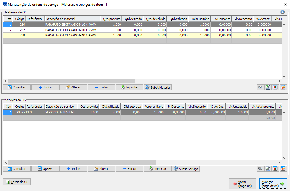 Grid consolidado dos Materiais e Serviços do item da Ordem de Serviço.