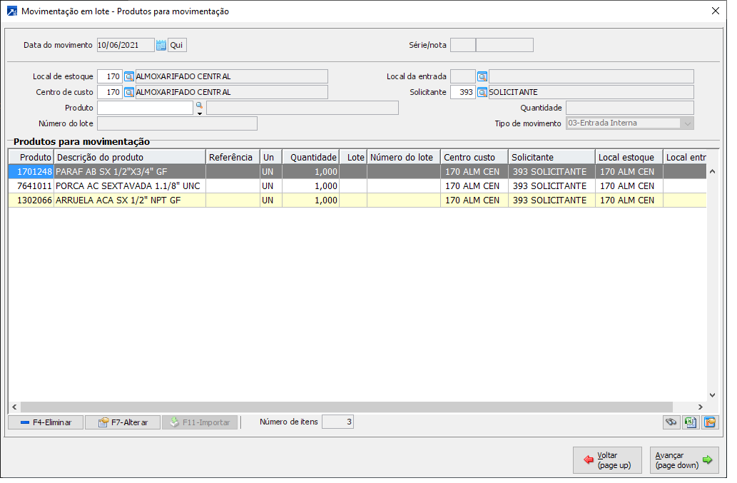 Além do produto e quantidade, também poderão ser informados por movimento de estoque o centro de custo, local de estoque, local de entrada e solicitante, caso seja configurado na primeira janela para alterar esses dados por movimento.