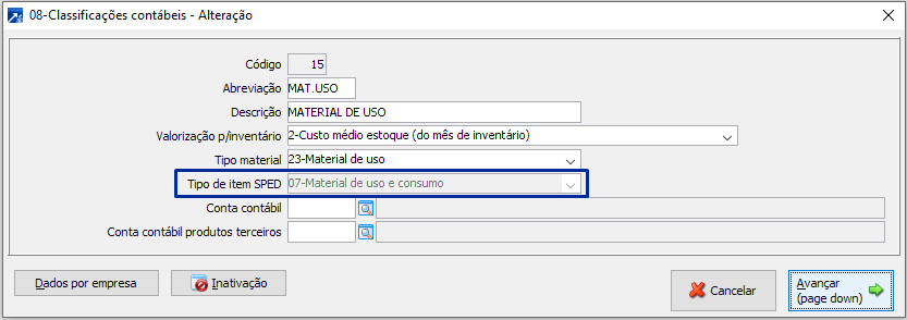 No SIGER® o Tipo de Item SPED é informado na Tabela Genérica de Classificações Contábeis, que posteriormente é associada ao cadastro do produto.