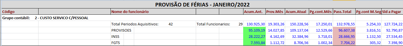 » Valor aqui representado pela coluna "Pass.Total", ou seja, para o mês atual irá considerar o valor bruto das provisões já descontado os valores pagos no mês.