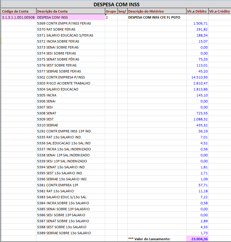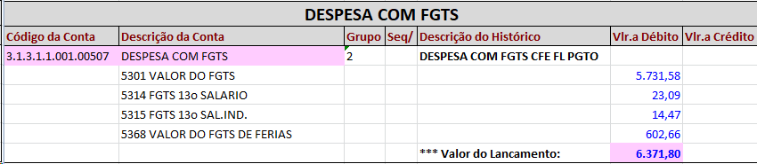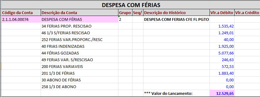 Observação: Todos os pagamentos de férias que ocorrem na folha mensal e na rescisão, serão debitados direto na despesa, Despesa com férias, Despesa com FGTS e Despesa com INSS.