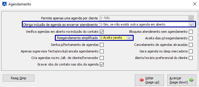 Já no modelo simplificado o sistema dará algumas opções "pré prontas" de horários e vai criar automaticamente o reagendamento sem que seja necessário o operador inserir muitos dados.