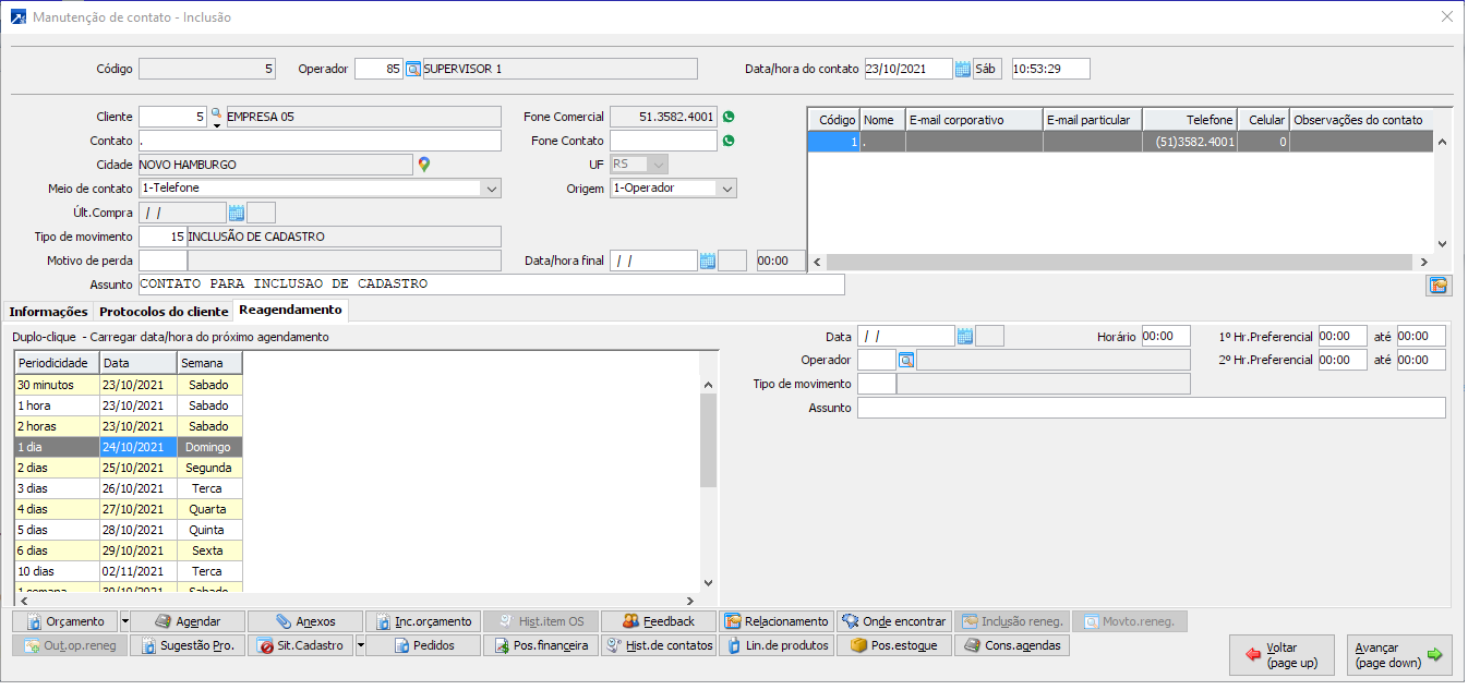 Então, por exemplo, se o cliente pedir para ligar em 1 dia bastará dar um duplo clique na opção correspondente.Ao salvar o contato "atual" o sistema automaticamente já criará um novo agendamento para o período de 1 dia a decorrer da data/hora atual.