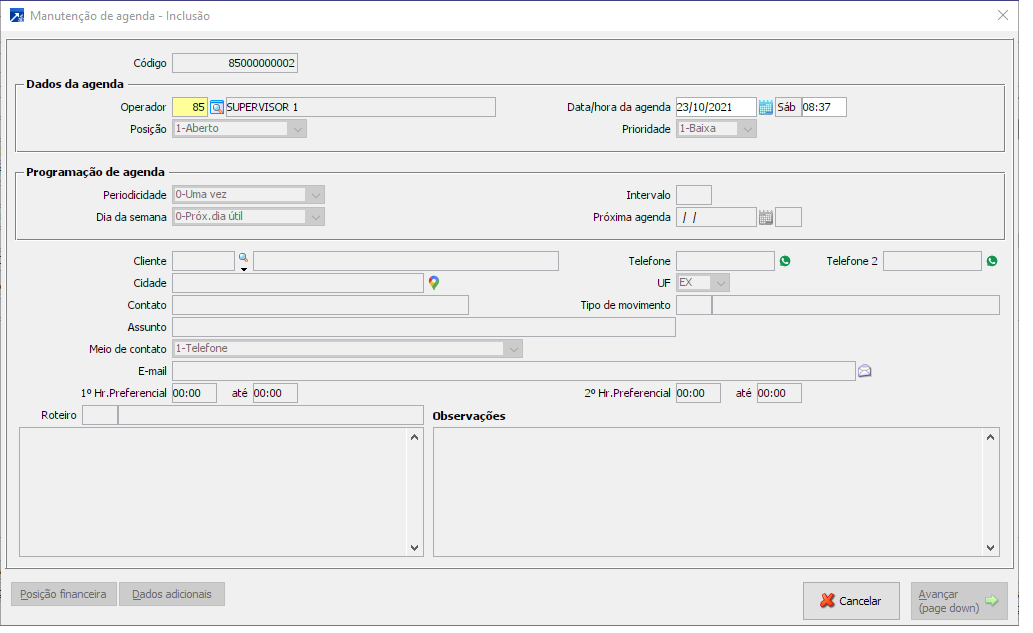 O sistema irá abrir a tela da agenda para cadastro.
