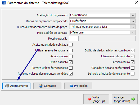 Detalhamento dos campos:"Aceita horário": Define se no reagendamento vai aceitar apenas horário da agenda ou se vai aceita apenas horário preferencial ou ambos."Aceita Tipo de Movimento": Aceita código do tipo de movimento na janela de ragendamento simplificado? Para saber mais sobre os tipos de movimento clique aqui -> + Saiba mais"Aceita assunto": Se aceita assunto (campo texto) no reagendamento"Aceita operador": Se aceita operador (código) no reagendamentoQual a diferença entre "1-Aceita Janela" e "3-Aceita Aba" ?Resposta: "1-Aceita Janela" irá abrir uma janela nova com as opções do reagendamento simplificado.Porém atentar: Para que a opção "1-Aceita Janela" funcione o campo "Obriga inclusão de agenda ao encerrar atendimento" deve estar com conteúdo diferente de 2-NãoExemplo: